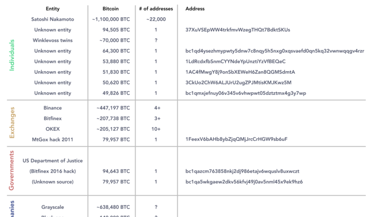 Die fünf Adressen mit den meisten Bitcoins gehören Binance, Bitfinex, MicroStrategy und einer anderen Adresse, deren Identität unbekannt ist. Diese fünf Adressen besitzen zusammen mehr als 778.000 Bitcoin. Die Börsenadressen stellen die Bestände vieler Einzelinvestoren dar, die keine eigenen Schlüssel besitzen.