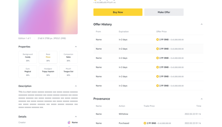 Jokaisella tuotesivulla on Tiedot-osio, jossa voit tarkistaa sen luomiseen käytetyn sopimuksen tiedot. Tämän osion avaaminen näyttää tärkeitä tietoja NFT:stä, kuten: Kokoelman sopimusosoite.