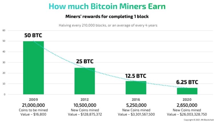Les mineurs vérifient chaque bloc et, une fois qu’ils l’ont confirmé, ils l’ajoutent à la blockchain. Pour avoir aidé à maintenir la sécurité du réseau, les mineurs gagnent des récompenses Bitcoin lorsqu’ils ajoutent des blocs. Les récompenses sont payées à l’aide de frais de transaction et par la création de nouveaux Bitcoins.