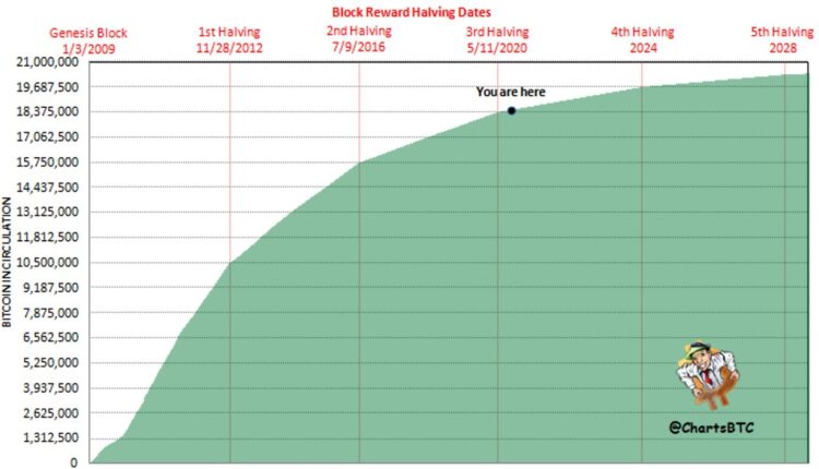 After every 210,000 blocks mined, or roughly every four years, the block reward given to Bitcoin miners for processing transactions is cut in half. This event is referred to as halving because it cuts in half the rate at which new bitcoins are released into circulation.