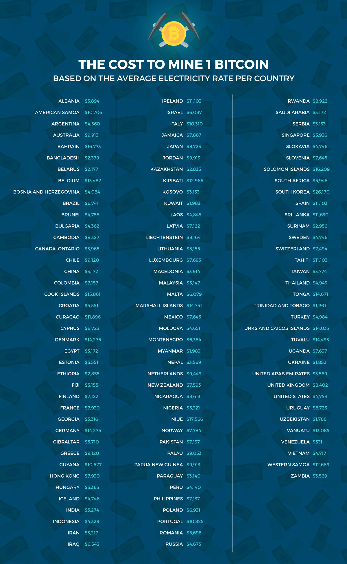 Given the high amount of energy needed to mine bitcoin, it can be a costly venture to get into. But exact prices fluctuate, depending on the location and the cost of electricity in the area.