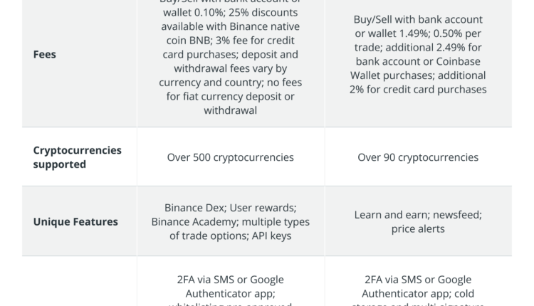 A 3.99% fee is applied for credit card purchases, 1.49% for Coinbase wallet or bank account purchases, and wire transfers are $10 for deposits and $25 for withdrawals. In summary, Binance offers much lower fees per transaction. It also provides a fee structure that encourages high-volume traders to use it.