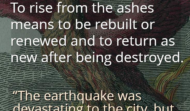 What does the saying rise from the ashes mean? Money By Gordan Smith On Dec 2, 2022 0 Share To make a comeback after a disaster that almost led to a tragic end; to make a comeback after a long hiatus; to come back into common use or practice, or back into popularity. Continue Reading 0 Share FacebookTwitterGoogle+ReddItWhatsAppPinterestEmail