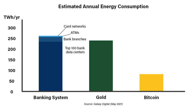 Badanie Galaxy Digital twierdzi, że według ich obliczeń zużycie energii przez bitcoin jest o połowę mniejsze niż w tradycyjnym systemie bankowym, które szacuje się na 263,72 terawaty na godzinę, a 240,61 terawatów w kopalniach złotana godzinę.