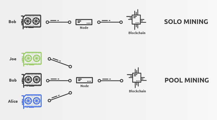 For someone to mine solo, one must first create a full node and communicate directly with the blockchain. This is what mining pools actually do. Mining pool operators will set up a bitcoin node (or any other cryptocurrency’s node) and act as a single miner. Only that this miner will have absurdly high hashing power.