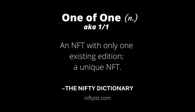 Um 1/1, 1 de 1, ou um de um, é um NFT que foi emitido como uma edição única e exclusiva. Um deles é visto como mais escasso e, portanto, mais valioso, porque apenas uma pessoa pode possuí-lo por vez.