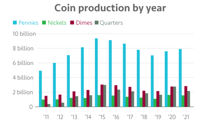 Quantas moedas dos EUA são cunhadas a cada ano?
