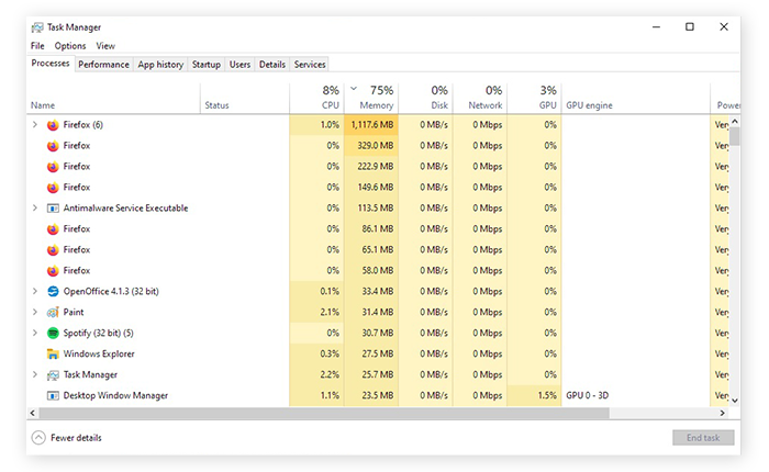 Você pode executar um teste de cryptojacking verificando o uso da unidade de processamento central (CPU) do dispositivo. Você pode verificar isso usando o Gerenciador de Tarefas ou o Monitor de Atividade. No entanto, isso pode não produzir resultados completos, porque os processos podem se esconder ou se mascarar como algo que parece legítimo.