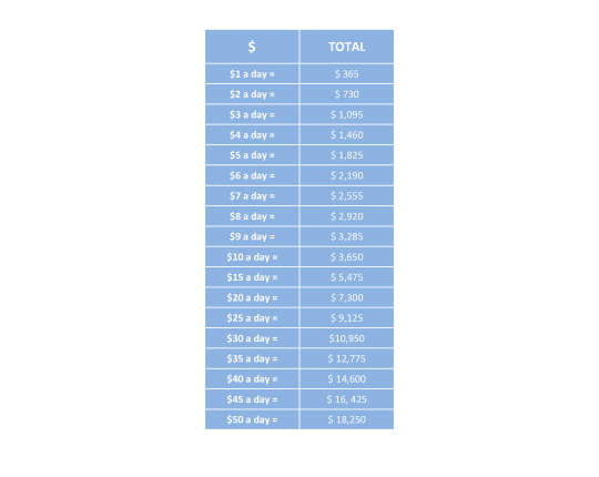 If you saved $5 a day for a year, you would have $1,825 dollars.