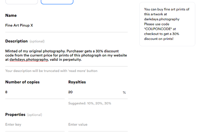 Unlock once purchased (optional) is data that you want to share with everyone who purchases your artwork. This is where I put my discount code for prints, so that it is only available to those who own your Rarible art.